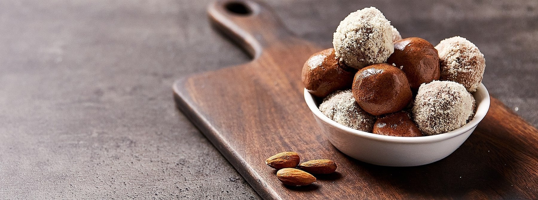 3. Roll each one in ground almonds to coat (any kind of chopped nut will work for this!) then enjoy straight away or keep in the fridge for later.