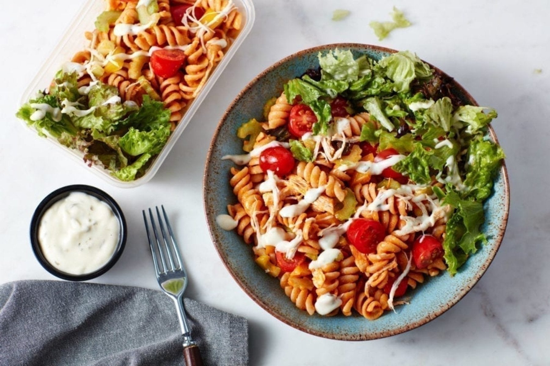 3. Pour over buffalo sauce and toss it through the pasta salad. Divide amongst 3 meal-prep containers and drizzle a little ranch dressing over each, and serve with a handful of mixed leaves or your favourite side salad. Refrigerate for up to 3 days and enjoy hot or cold.
