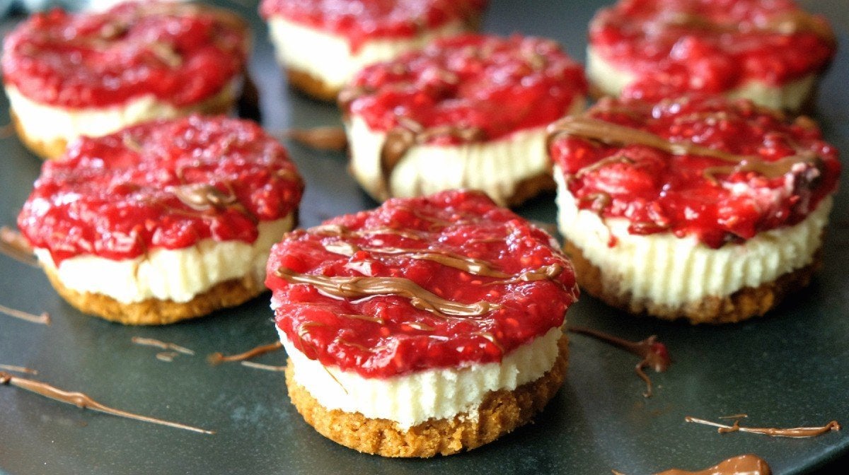 Remove cheesecakes from oven, top with berry jam and decorate with melted chocolate hazelnut Protein Spread. Transfer to fridge and chill for at least 1 hour, then enjoy!