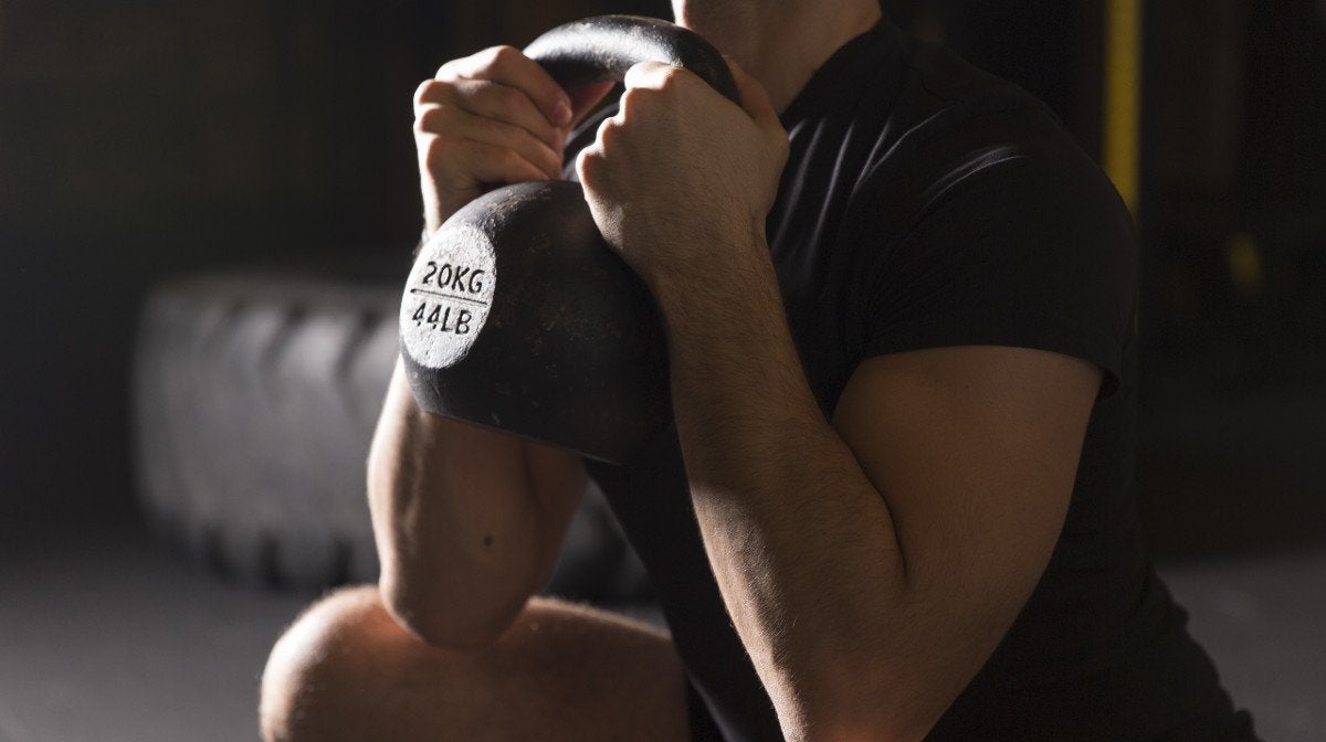 - Grip a dumbbell at one end (in a vertical position) and hold it close to your chest. It can also be performed using a kettlebell.